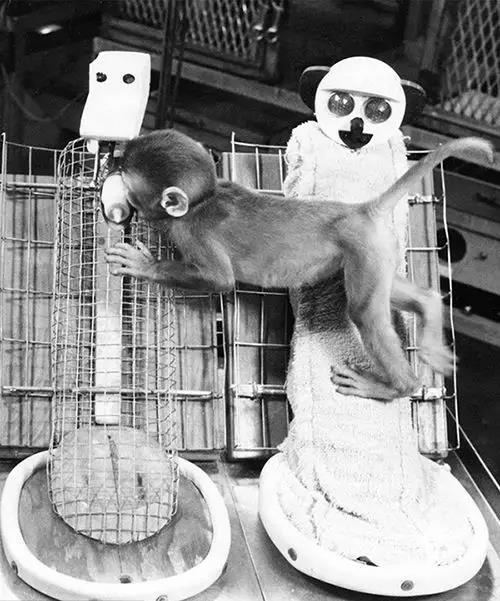 有的小猴甚至饿了也不愿过去,它们把身子挂在 “绒布妈妈” 身上,只把头探到 “铁猴妈妈” 那边吃奶。